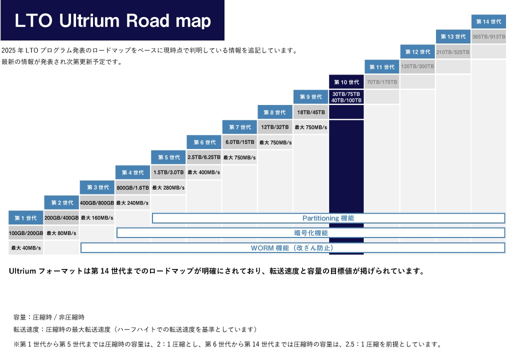 2000年に発売されたLTO1から約20年以上経過した現在、LTO-10までの製品化が進み、速度は15倍(LTO1:20MB/秒→LTO9:300MB/秒※1)、容量は300倍(LTO1:100GB→LTO10:30TB & 40TB※2)へと大きな進化を遂げており、今後の計画も発表されています。